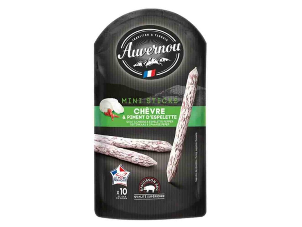 SLOŽENÍ: Vepřové maso, kozí sýr 3,2 %(MLÉKO), sůl, laktóza, koření (obsahuje pepř Espelette 0,2 %), dextróza, cukr, aromatické byliny, konzervanty: dusičnan draselný a dusitan sodný, fermenty. Střívko: kolagenní střívko (kolagen, glycerin, celulóza).