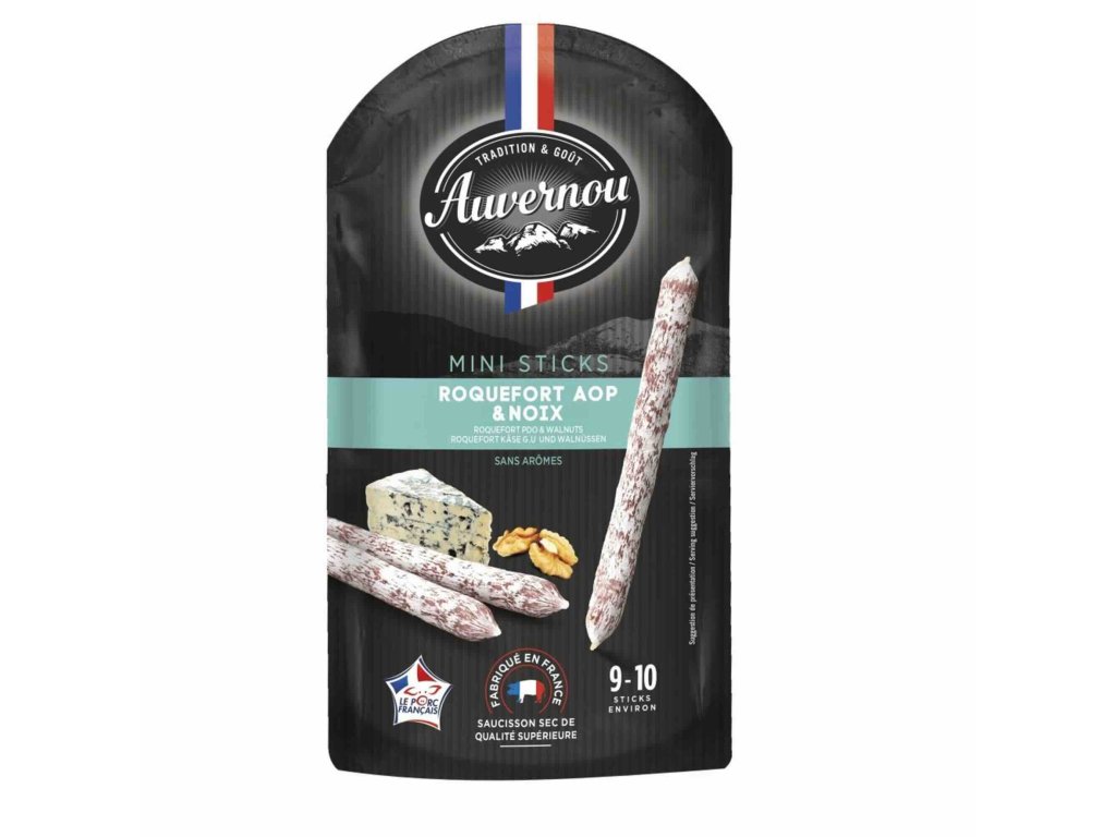 SLOŽENÍ: Vepřové maso (původ: Francie), Roquefort CHOP 5,1 % (MLÉKO), OŘECHY 4,2 %, laktóza, sůl, pepř, dextróza, cukr, muškátový oříšek, konzervanty: dusičnan draselný a dusitan sodný, česnek, enzymy, střívko (kolagenní střevo).